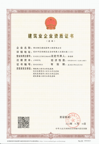 在一个高速发展的时代,企业要获得竞争优势,其必不可少的条件之一就是企业资质。近日,湖北枫艺建筑装饰工程有限公司晋升为建筑业一级资!一级资质对建筑企业经营实力有着极高的要求,可以衡量建筑企业的整体实力,是一个地区建筑业发展水平的重要标志。