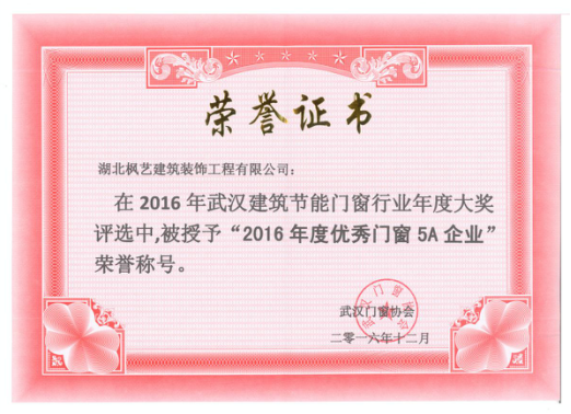 湖北枫艺建筑装饰工程有限公司在门窗协会开展的2016年度武汉市建筑门窗优秀企业评选活动中,以高网络人气与高口碑值被授予“2016年度优秀门窗5A企业”荣誉称号,实至而名归。